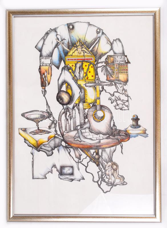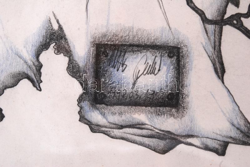 Leírás: Olvashatatlan jelzéssel: Üzenet. Színes ceruza, papír, üvegezett keretben, 55×38 cm