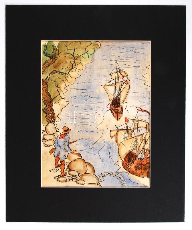 Leírás: Pataki Dénes (1921-1975): Felfedezők. Akvarell-tus, papír, paszpartuban, 20×15 cm