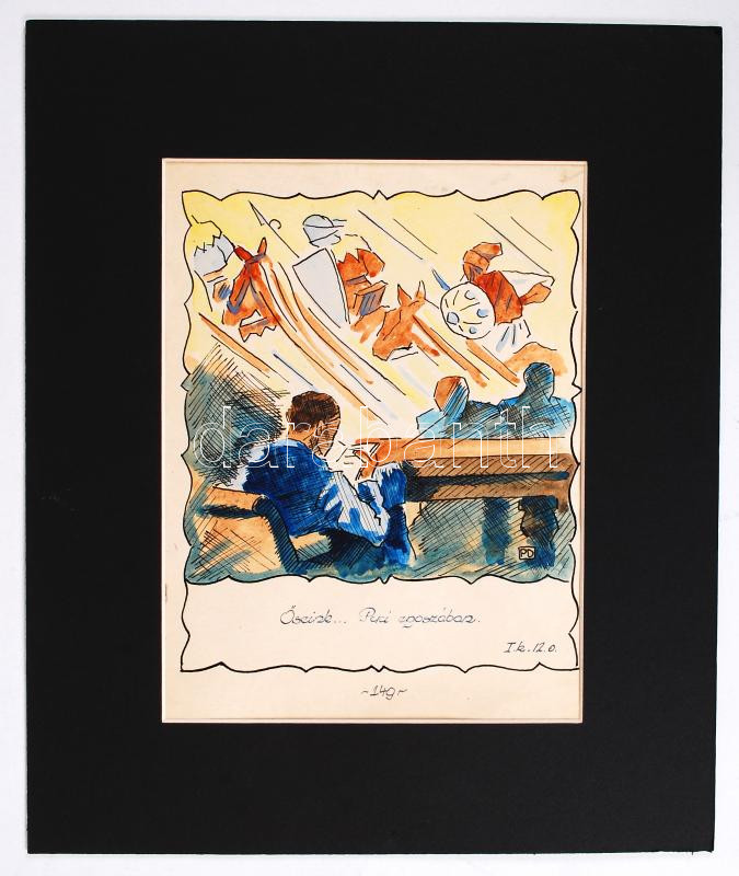 Leírás: Pataki Dénes (1921-1975): Őseink. Akvarell-tus, papír, paszpartuban, 20×15 cm