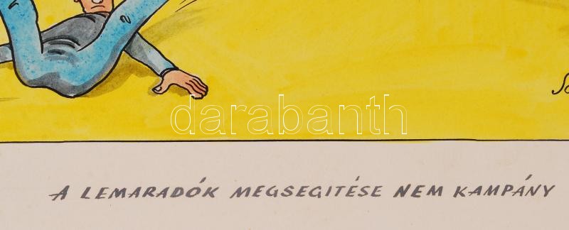 Leírás: Schwott Lajos (1907-1987): A lemaradók megsegítése nem kampány. Papír, vegyes technika, jelzett, 40x49cm