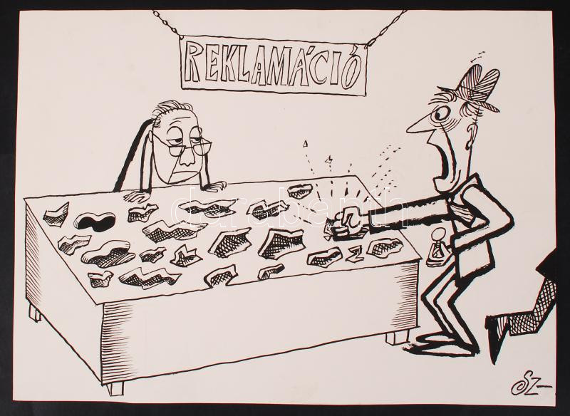 Szűr-Szabó József(1902-1988): Reklamáció. Papír, tus, jelzett, 40x29cm https://www.darabanth.com/hu/202-Gyorsarveres/202.0/Festmeny-mutargy-papirregiseg-egyeb/Festmenyek-es-grafikak~200003/Szur-Szabo-Jozsef1902-1988-Reklamacio-Papir-tus-jelzett-40x29cm~II803953