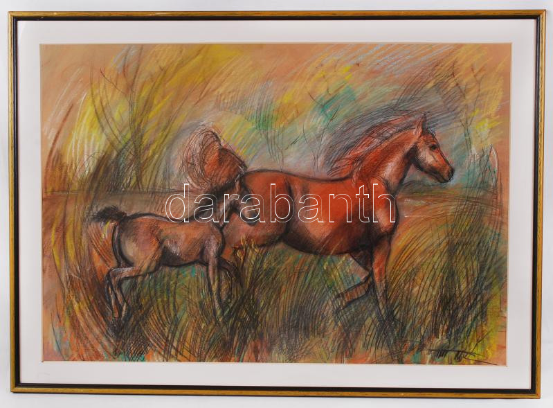 Leírás: Titi Mária: Csikó az mezőn. Vegyes technika, papír, jelzett, üvegezett keretben 44×63 cm