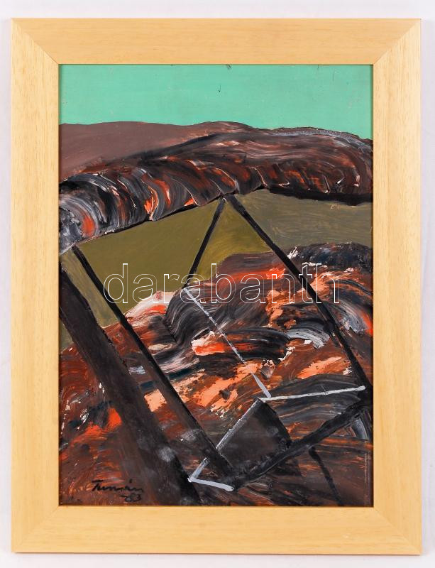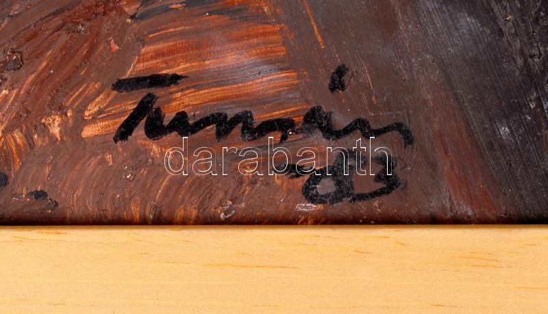 Leírás: Turcsán Miklós (1944-): Tájkép ketreccel. Olaj, karton, jelzett, újszerű keretben 38×26 cm