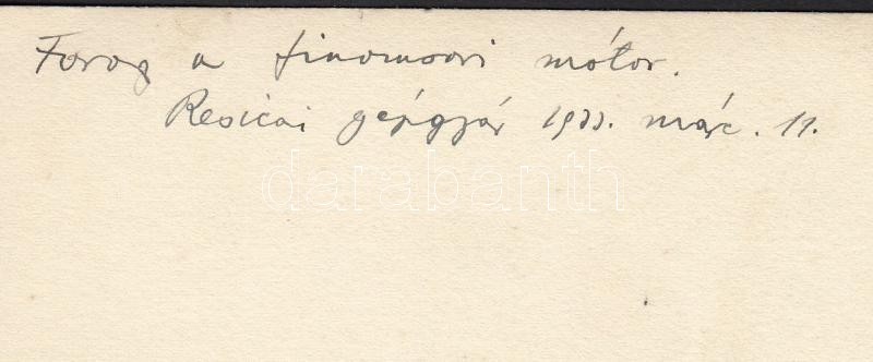 1933 Resicai Gépgyár, forog a motor, feliratozott, 19x13 cm https://www.darabanth.com/hu/202-Gyorsarveres/202.0/Festmeny-mutargy-papirregiseg-egyeb/Foto~200042/1933-Resicai-Gepgyar-forog-a-motor-feliratozott-19x13-cm~II800181