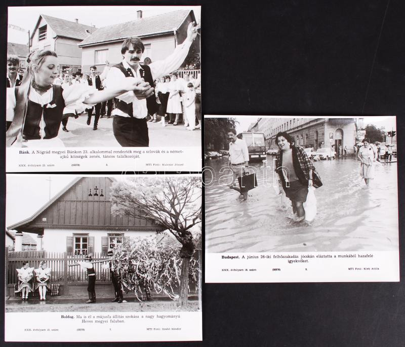 Leírás: 1989 MTI fotók: Májusfa állítás; Nemzetiségek találkozója; Felhőszakadás, 3 db fotó, feliratozott, 24x21 cm