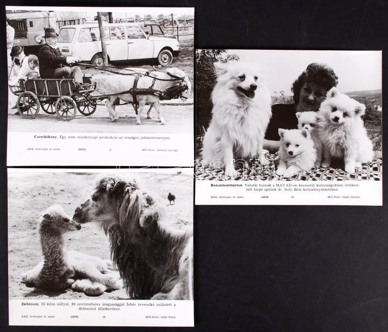 Leírás: 1989 MTI fotók: Törpe spitzek; Tevék a debreceni állatkertben; Juhok által húzott kiskocsi, 3 db fotó, feliratozott, 24x21 cm
