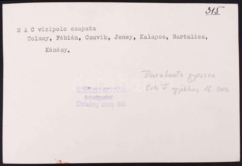 cca 1940-1945 A MAC vízilabda csapata hátoldalon nevek felsorolásával,... https://www.darabanth.com/hu/202-Gyorsarveres/202.0/Festmeny-mutargy-papirregiseg-egyeb/Foto~200042/cca-1940-1945-A-MAC-vizilabda-csapata-hatoldalon-nevek-felsorolasaval-17x11-cm~II805297
