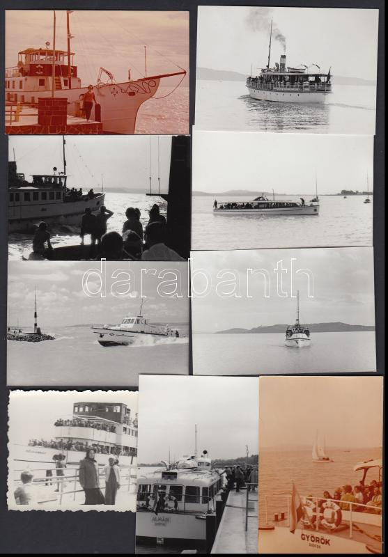 Leírás: cca 1950-1970 Balatoni hajók (Jókai, Almádi, Prága, Györök, Beloiannisz, Csobánc, Szigliget, Tátika, Kelén), 9 db fotó, 6x9 cm