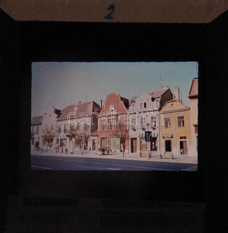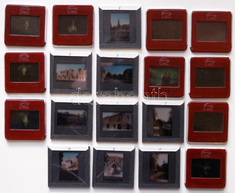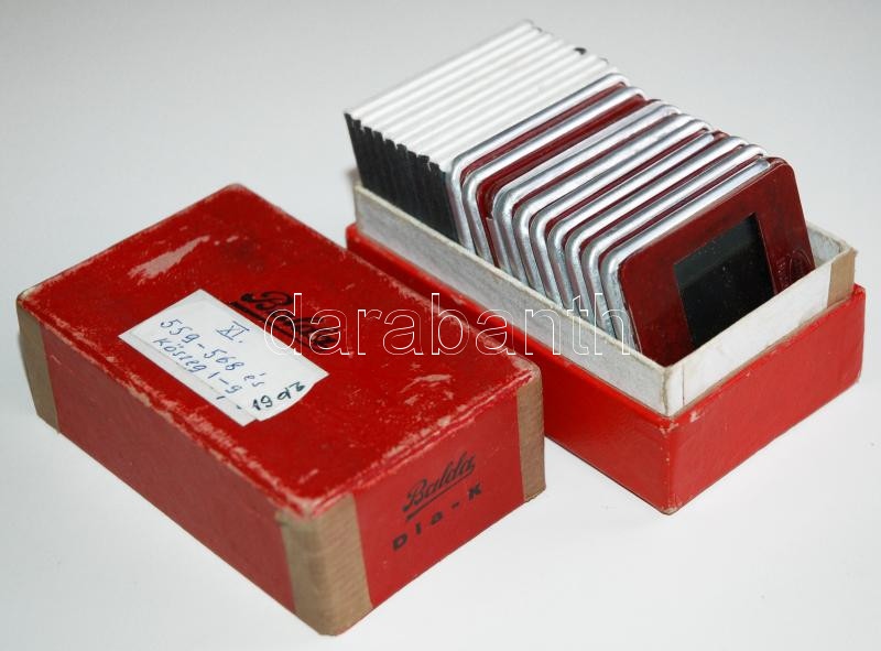 Leírás: cca1940/1981 19db diapozitív régi családi fotókkal, és modern kőszegi városképekkel, eredeti dobozban
