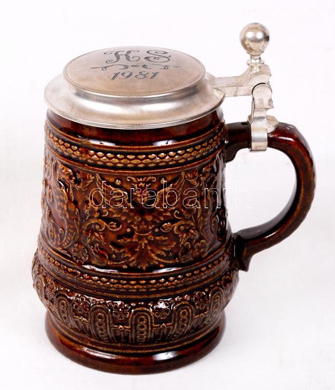 Leírás: Kerámia söröskorsó gravírozott fém fedéllel, jelzett, m: 15 cm