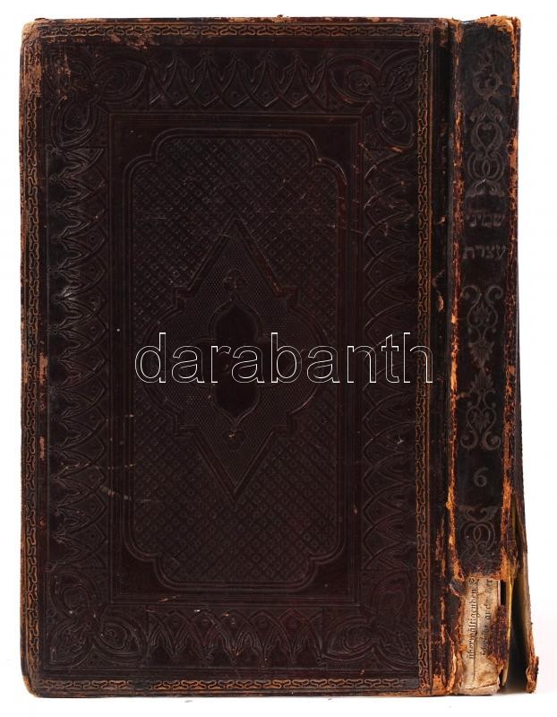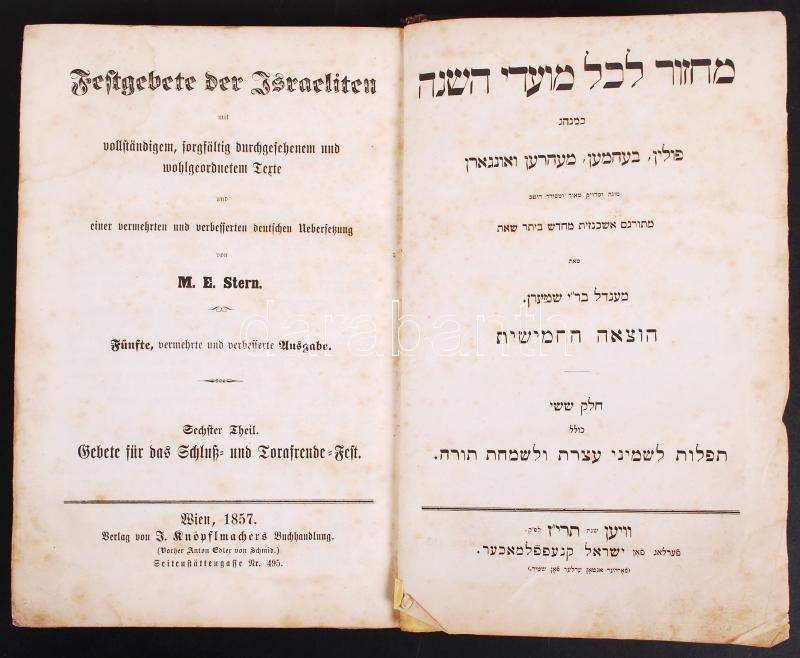 M.E. Stern: Festgebete der Israeliten mit volsständigem, sorgfältig durchgesehenem und wohlgeordnetem Texte und einer vermehrten und verbesserten deutschen Übersetzung. (Izraeliták ünnepi imádságai). Fünfte Ausgabe (Ötödik Kiadás). Wien (Bécs), 1857, Verlag von J. Knöpflmachers Buchhandlung. Bőr kötés, gerince sérült.