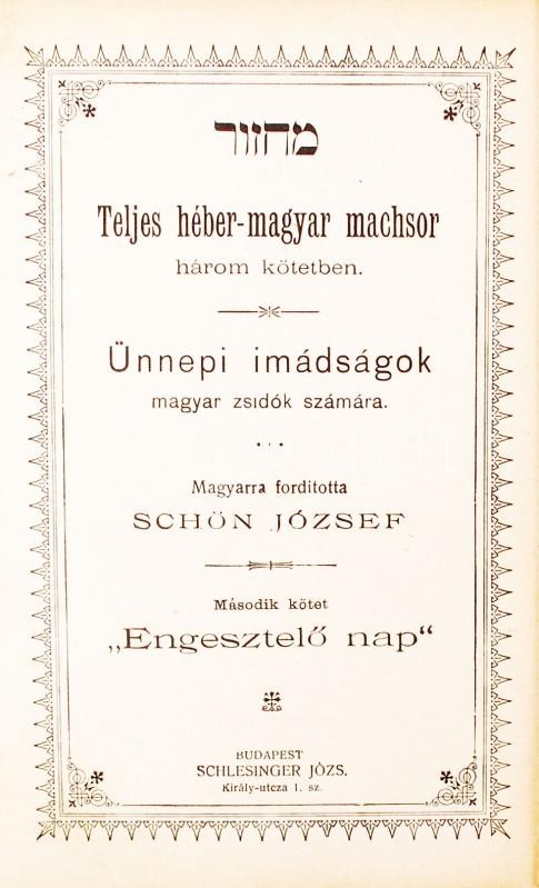 Leírás: Ünnepi imádságok magyar zsidók számára II. Engesztelő nap Bp., é.n. Schlesinger Egészvászon kötésben