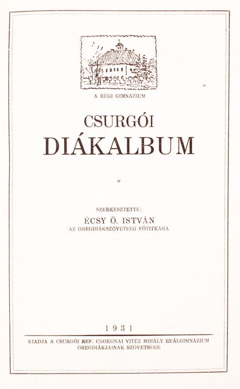 Leírás: Écsy Ö. István (szerk.): Csurgói Diákalbum. 1931, Csurgói Ref. Csokonai Vitéz Mihály Reálgimnázium Öregdiákjainak Szövetsége. Képekkel illusztrált, kiadói aranyozott egészvászon kötés, kopottas állapotban.