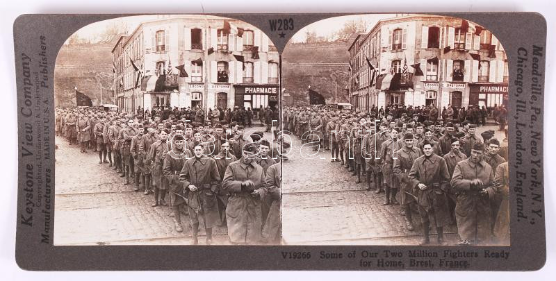 Leírás: cca 1918 I. világháború. Amerikai katonák Brestben. Sztereófotó. /