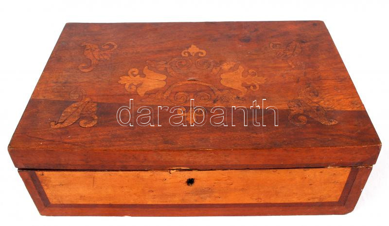 Antik intarziás fa doboz, sérült, kulcs nélkül, 28×19 cm, m:9 cm https://www.darabanth.com/hu/202-Gyorsarveres/202.0/Festmeny-mutargy-papirregiseg-egyeb/Mutargyak-antikvitas~200008/Antik-intarzias-fa-doboz-serult-kulcs-nelkul-28C39719-cm-m9-cm~II803937