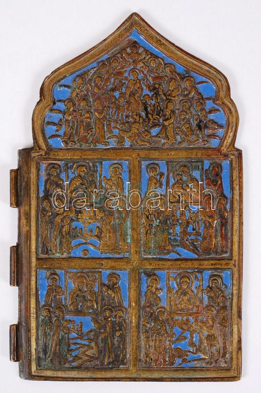 Leírás: cca 1850 Pravoszláv triptichon-töredék domborműves jelenetekkel, zománcozott bronz relief /