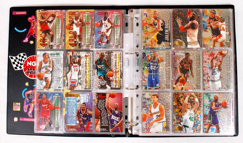Leírás: 192 darabos kosárlabda-kártya gyűjtemény és 18 db focista kártya, albumban
