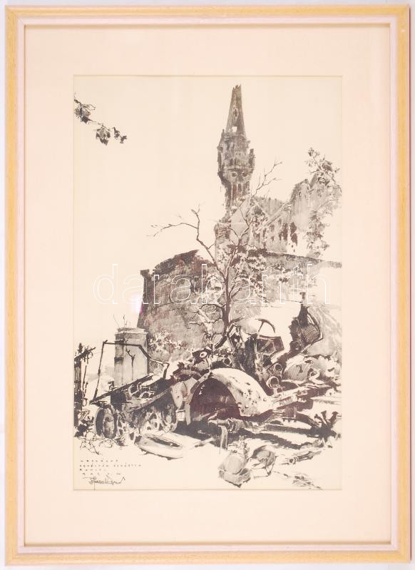 Pfannl Egon (1911 - 1973): Országos Levéltár és bástya romjai. Nagyméretű nyomat, üvegezett igényes keretben 50×36 cm / Budapest after the World War II, offset