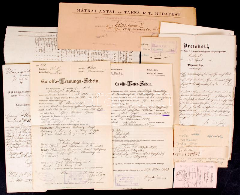 1820-1946 Vegyes német és magyar nyelvű irat tétel (feladóvevény, elszámolás, jegyzőkönyv, halotti anyakönyvi kivonat, épületfa-árjegyzék, anyakönyvi kivonat, győri vasbetonhidak leírása), 9 db + cca 1849 Kitöltetlen német nyelvű táblázat megyére és városra lebontva a beteg és elhullott lovakról, juhokról és szarvasmarhákról.