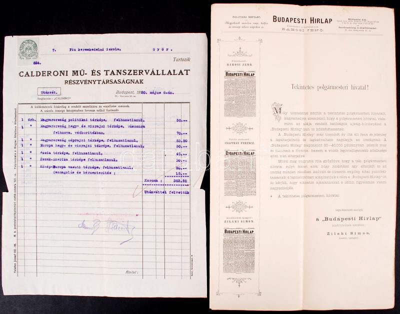 1892, 1920 Győr, Budapest, Arra vonatkozó kérelem, hogy a polgármesteri hivatal és az alá rendelt hatóságok újsághirdetései a Budapesti Hírlapban is megjelenjenek; Calderoni Mű- és Tanszervállalat Részvénytársaság fejléces számlája