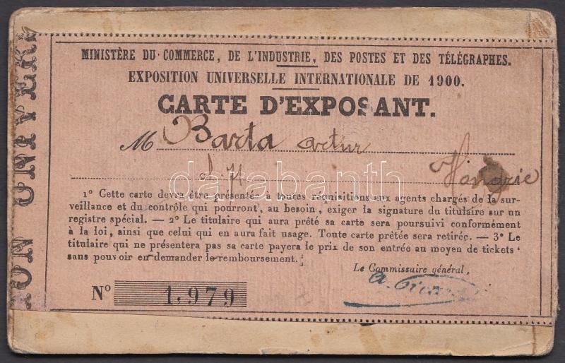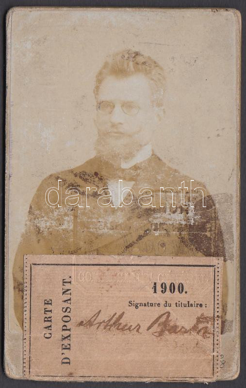 1900 Párizsi Világkiállítás Bartha Artur fényképes kiállítói igazolván... https://www.darabanth.com/hu/202-Gyorsarveres/202.0/Festmeny-mutargy-papirregiseg-egyeb/Okmanyok~200028/1900-Parizsi-Vilagkiallitas-Bartha-Artur-fenykepes-kiallitoi-igazolvanya--3Cbr3E1900-Par~II722587