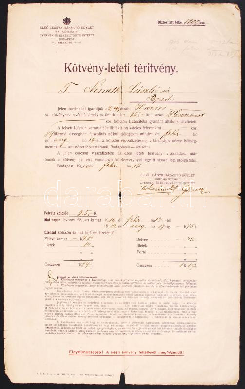 Leírás: 1910 Első Leánykiházasító Egylet Min Szövetkezet Gyermek- és Életbiztosító Intézet által kiállított kötvény-letéti tértivevény.