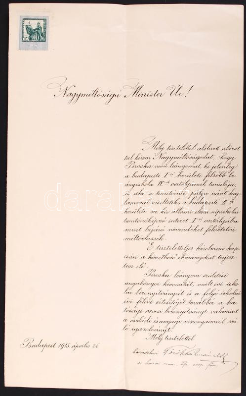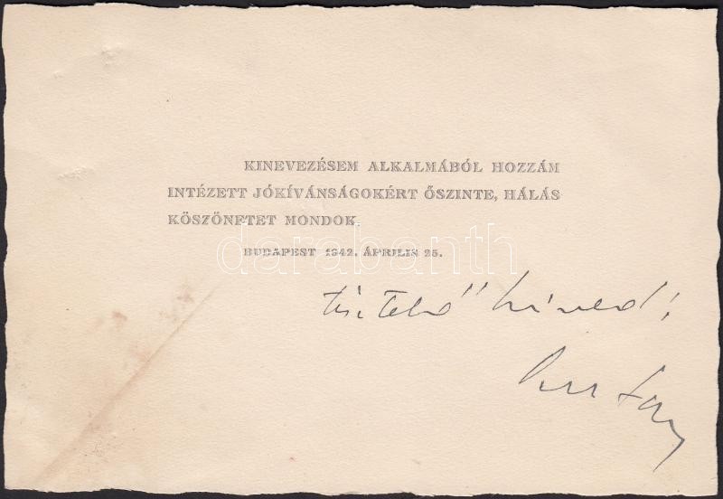 1915 Bp., Török Kálmán császári és királyi altábornagy folyamodványa a közoktatásügyi miniszterhez, amelyben lánya felvételét kéri a tanítóképző intézetbe. + 1942 Bp., Antal István (1896-1975)nemzetvédelmi propagandaminiszter saját kezű aláírása a kinevezése alkalmából küldött köszönő kártyán.