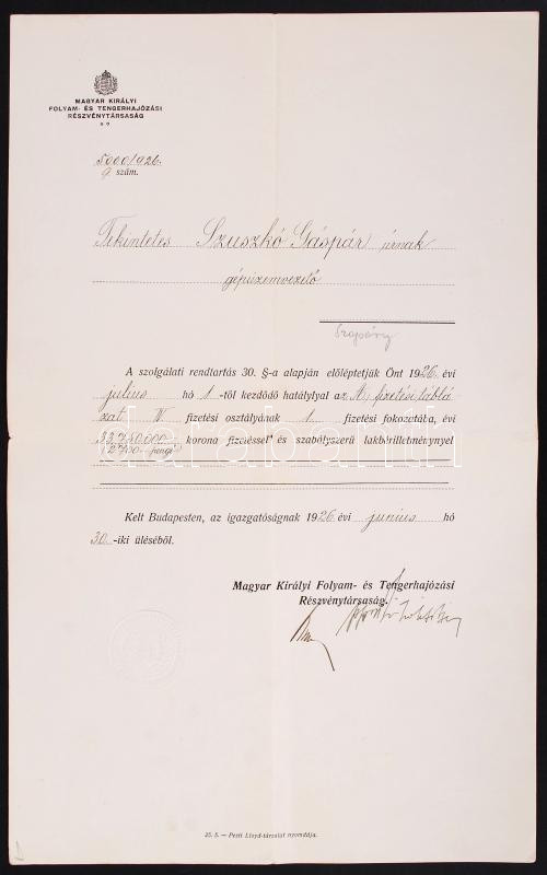 1923 Magyar Folyam és Tengerhajózási Rt. előléptető oklevél hajógépész... https://www.darabanth.com/hu/202-Gyorsarveres/202.0/Festmeny-mutargy-papirregiseg-egyeb/Okmanyok~200028/1923-Magyar-Folyam-es-Tengerhajozasi-Rt-elolepteto-oklevel-hajogepesz-reszere~II743101