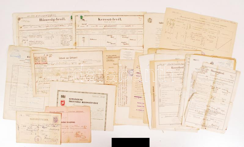 Leírás: cca 1895-1948 Vegyes okmány tétel, 29 db (Budapesti Népegészség vezetőjétől bizonyítvány, himlőoltási bizonyítvány, keresztlevél, házasságlevél, végzés, jegyzőkönyv, törlési engedély, érettségi bizonyítvány, születési anyakönyvi kivonat, származási táblázat)