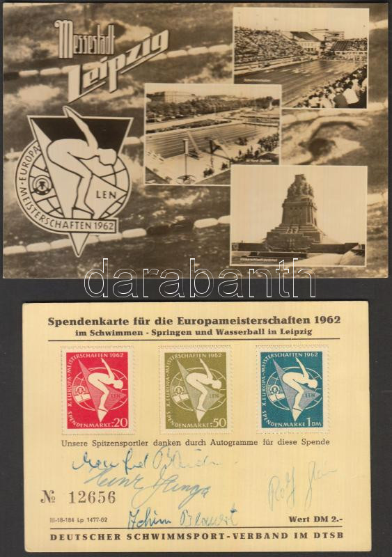 1962 Úszó- és vízilabda EB kártya adománybélyegekkel és aláírásokkal +... https://www.darabanth.com/hu/202-Gyorsarveres/202.0/Festmeny-mutargy-papirregiseg-egyeb/Parafilatelia~200025/1962-Uszo-es-vizilabda-EB-kartya-adomanybelyegekkel-es-alairasokkal-plus-1-kepeslap~II800379