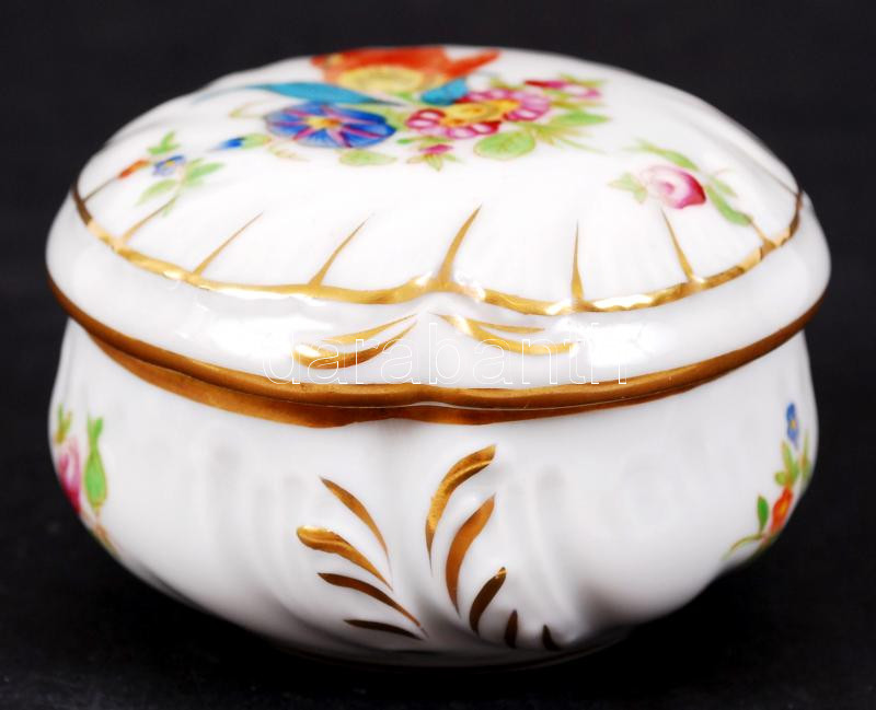 Herendi virágmintás porcelán bonbonier, hibátlan, jelzett, d: 7,5 cm https://www.darabanth.com/hu/202-Gyorsarveres/202.0/Festmeny-mutargy-papirregiseg-egyeb/Porcelan~200013/Herendi-viragmintas-porcelan-bonbonier-hibatlan-jelzett-d-7-5-cm~II802784