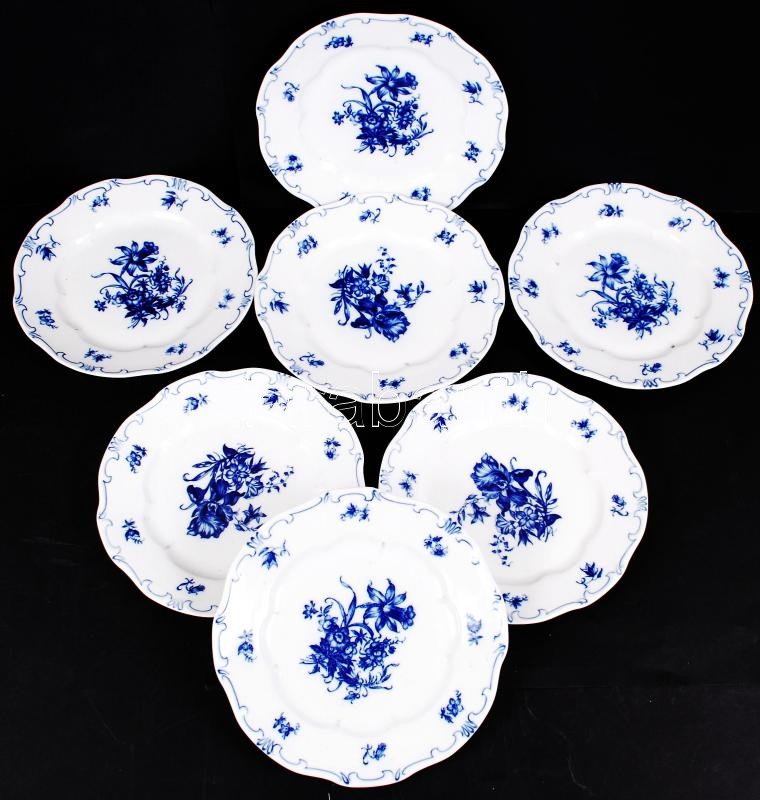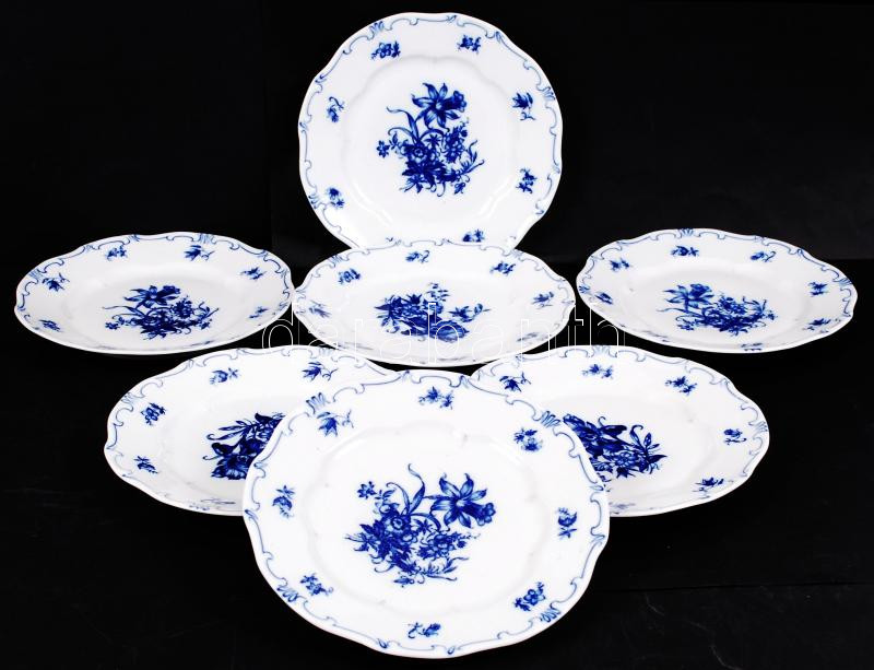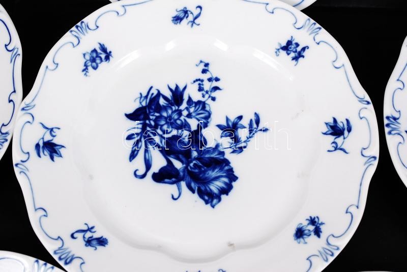 Leírás: Zsolnay lapos tányér készlet, kettő sérült, máz alatti kék festéssel, jelzett, d:23,5 cm