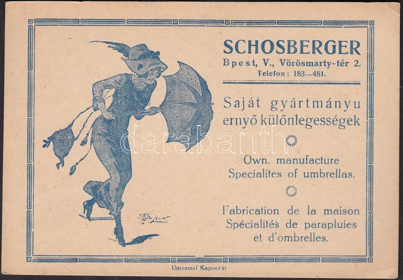 Leírás: Schosberger Budapest esernyő hirdetés, többnyelvű szórólap