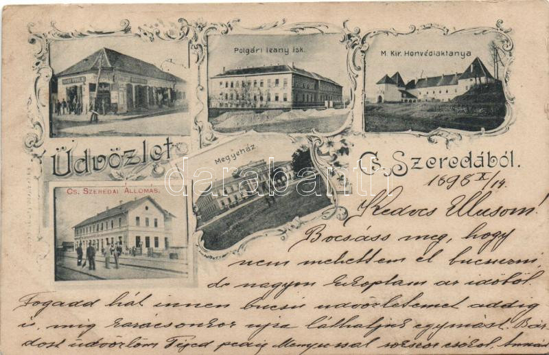 1898 Csíkszereda Nagy Gyula üzlete, honvéd laktanya, polgári leányiskola, vasútállomás, megyeháza / shop, military barracks, girl school, railway station, county hall, floral (wet damage)