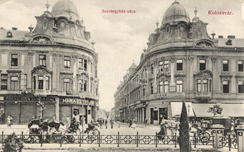 Kolozsvár Szentegyház utca, Frank Kiss János fiai, Haraszthy Jenő üzle... https://www.darabanth.com/hu/202-Gyorsarveres/202.0/Kepeslapok/Erdely~400006/Kolozsvar-Szentegyhaz-utca-Frank-Kiss-Janos-fiai-Haraszthy-Jeno-uzletei-Gresham-biztosito-~II800888