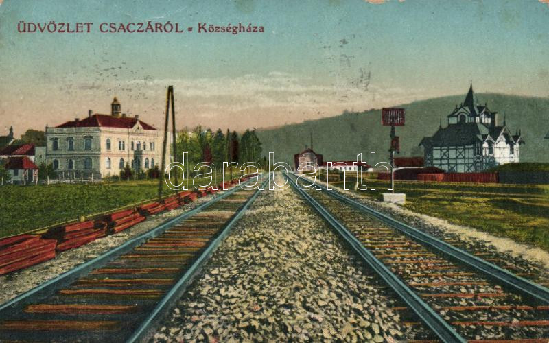 Leírás: Csaca, Csacza; Községháza, vasút / town hall, railroad