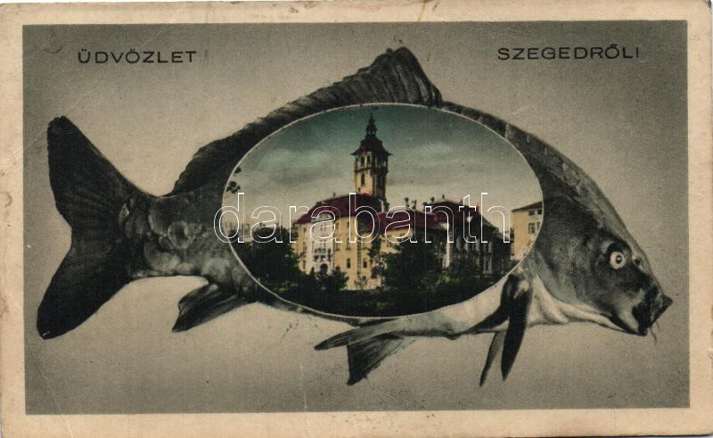 Leírás: 2 db régi képeslap (Szeged városkép, II. világháborús grafikai lap)