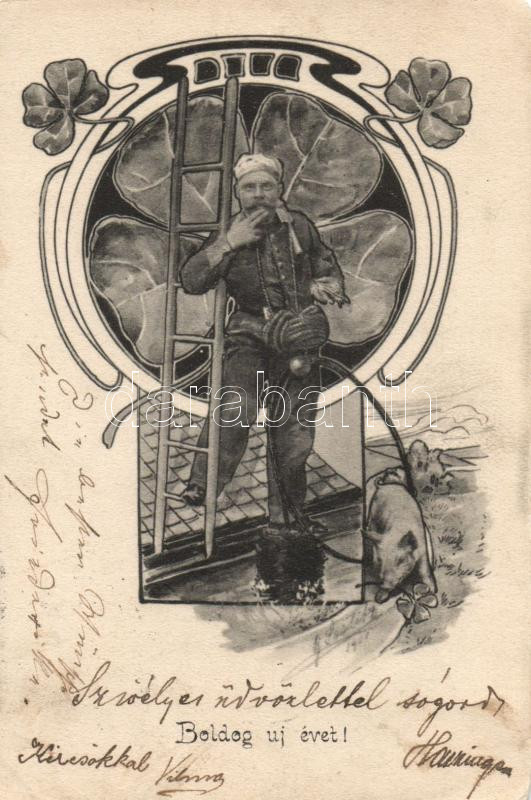 New Year, chimney sweeper, Art Nouveau (wet corners) https://www.darabanth.com/hu/202-Gyorsarveres/202.0/Kepeslapok/Udvozlolap~600088/New-Year-chimney-sweeper-Art-Nouveau-wet-corners~II787324