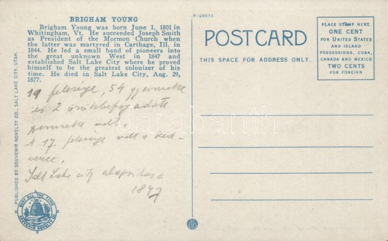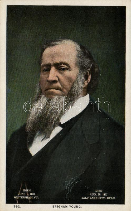 Brigham Young, President of the Mormon Church https://www.darabanth.com/hu/202-Gyorsarveres/202.0/Kepeslapok/Vallas~600089/Brigham-Young-President-of-the-Mormon-Church~II699889