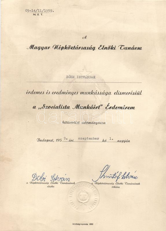 Leírás: 1959. "Szocialista Munkáért" érdemérem adományozó oklevele Dobi István (1898-1968) aláírásával
