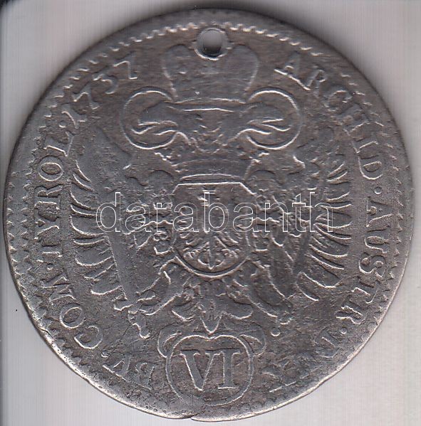 Austria 1737. 6 ... https://www.darabanth.com/hu/202-Gyorsarveres/202.0/Numizmatika/Kulfoldi-fem-es-ezustpenzek~600013/Ausztria-1737-6Kr-Ag-III-Karoly-T3-Ly-3Cbr3EAustria-1737-6-Kreuzer-Ag-Charles-VI-CF-holed~II805142
