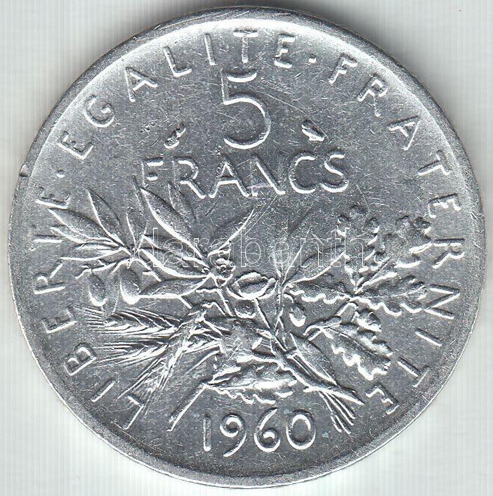 Krause KM... https://www.darabanth.com/hu/202-Gyorsarveres/202.0/Numizmatika/Kulfoldi-fem-es-ezustpenzek~600013/Franciaorszag-1960-5Fr-Ag-T2-3Cbr3EFrance-1960-5-Francs-Ag-CXF-3Cbr3EKrause-KM23926~II800514