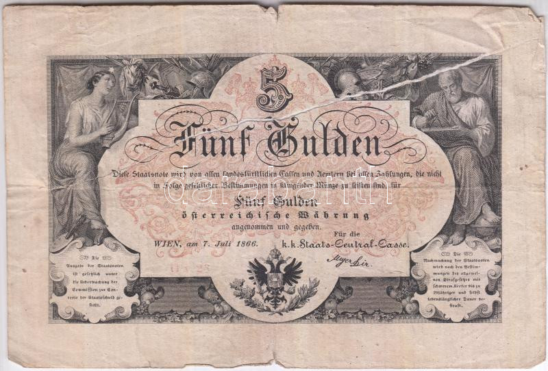 Leírás: 1866. 5G "K.K.Staats-Central-Cassa" T:IV keresztben szakadás