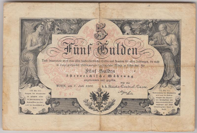 Leírás: 1866. 5G "K.K.Staats-Central-Cassa", vízjellel T:III,III- hajtásnál beszakadás