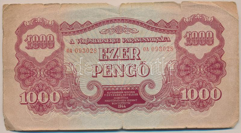 1944. 1000P "A Vöröshadsereg Parancsnoksága" T:III- https://www.darabanth.com/hu/202-Gyorsarveres/202.0/Numizmatika/Magyar-bankjegyek~600008/1944-1000P-A-Voroshadsereg-Parancsnoksaga-TIII-~II802869