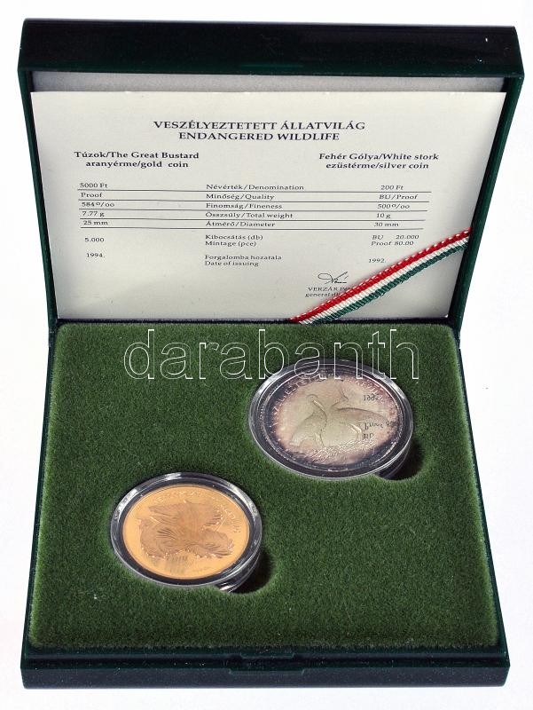 1992. 5000Ft Au "Túzok" (7.77g/0.584) + 200Ft Ag "Fehér gólya" (10g/0.500) párban, díszdobozban és tanúsítvánnyal T:PP
