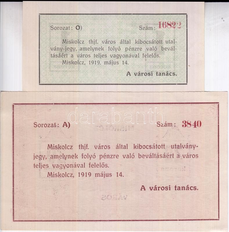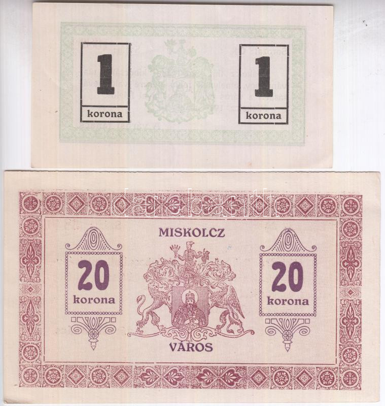 Leírás: Miskolcz 1919. május 14. 1K + 20K utalványok T:I-,II (hajtatlanok)