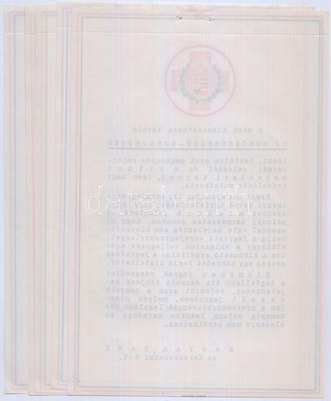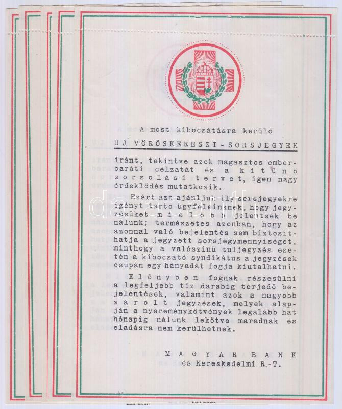 Leírás: Az Új Vöröskereszt sorsjegyek kibocsátásáról szóló kiadvány 5 példánya Magyar Bank és Kereskedelmi Rt.-től