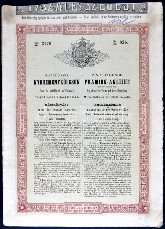 1880. "Kamatozó Nyereménykölcsön" Tisza és mellékfolyói szabályozására - Szeged város újjáépítésére, részkötvény osztrák értékű 100Ft-ról szelvénnyel T:III