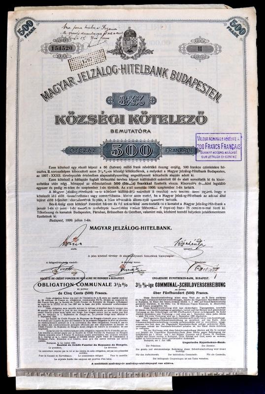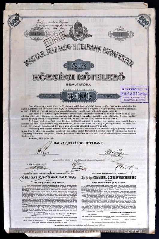 1899. "Magyar Jelzálog Hitelbank Budapesten" 3 1/2%-os Közsé... https://www.darabanth.com/hu/202-Gyorsarveres/202.0/Numizmatika/Reszvenyek-es-sorsjegyek~600006/1899-Magyar-Jelzalog-Hitelbank-Budapesten-3-1225-os-Kozsegi-Kotelezo-bemutatora-500Fr-rol-~II801331